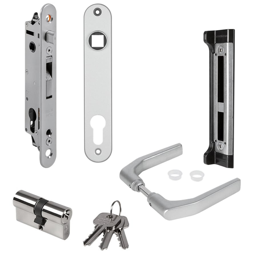 Fortylock komplet za ograje vključuje vse potrebno za zaklepanje (Locinox Fortylock ključavnico, par ščitov, cilinder 30×30 mm s ključi, par kljuk in sprejemnik SFKI).