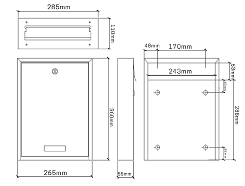 Poštni nabiralnik je zasnovan za montažo v vhodna ali vrata ograje. Opremljen je s sprednjo ploščo dimenzij 285 x 145 mm, izdelano iz brušenega nerjavečega jekla, ki vključuje sprednjo režo za pošto velikosti 241 x 38 mm. Reža je zaščitena s pokrovom, ki učinkovito ščiti pred vremenskimi vplivi.